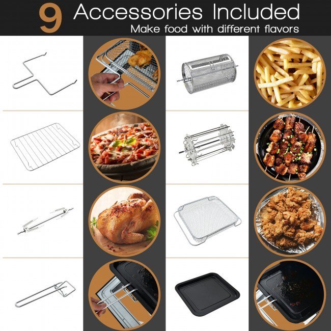 3.9 Accessories and Low Maintenance: There are 9 accessories in the package for wide application, including fetch tool, baking cage, 2pcs wire rack, rotating basket, rotisserie shaft, mesh basket and tray handle and dripping tray.