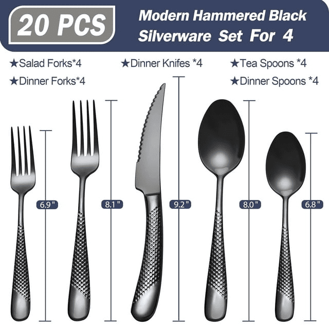 Runfly 20 Piece Hammered Black Silverware Set, 18/10 Stainless Steel Flatware Set, Set Service for 4 Runfly 20 Piece Hammered Black Silverware Set, 18/10 Stainless Steel Flatware Set, Set Service for 4 Runfly 20 Piece Hammered Black Silverware Set, 18/10 Stainless Steel Flatware Set, Set Service for 4